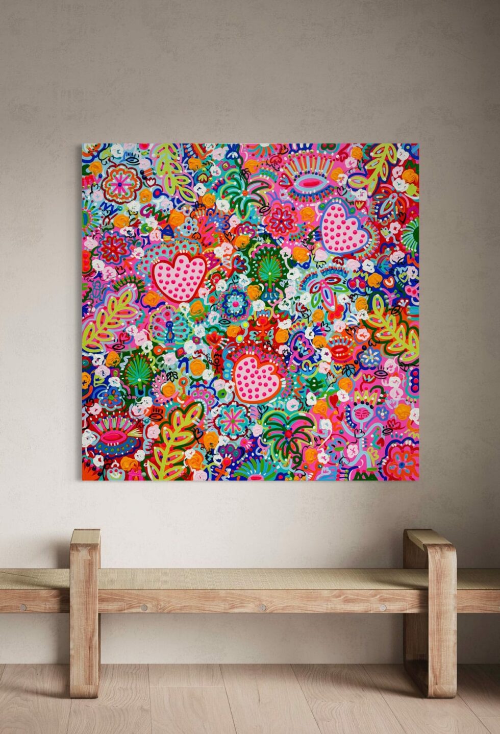 The Eyes of Daydreams, with their long, colorful eyelashes, are unconsciously inspired by representations of the Egyptian eye. They represent protection and watch over this enchanted garden. Above all, for the artist, they are the subtle connection between the waking world and the dream world painted in the work. These eyes, full of color and life, seem to invite viewers to lose themselves in this enchanted garden.
