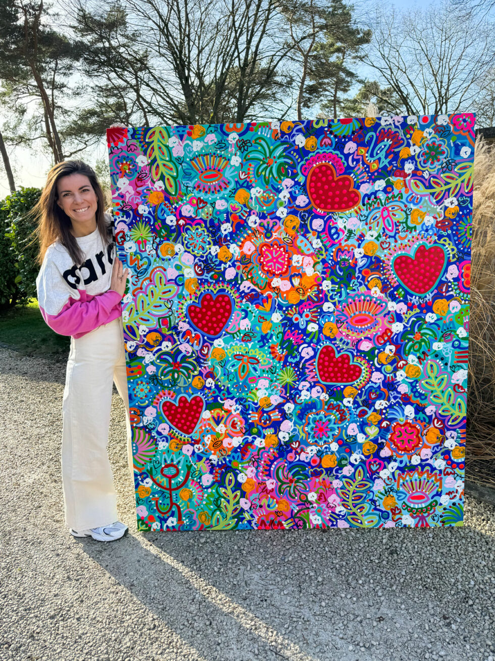 The Strawberries of the heart, the beating hearts of the canvases, symbolize love and life. Their number varies from work to work, but they are never alone. Strawberry hearts breathe a sense of intense life, perpetual movement and positive energy into the painting. They embody the sweetness of love, the deliciousness of a marshmallow strawberry, the taste of innocence. Shouldn’t love in a garden of dreams be child’s play?
