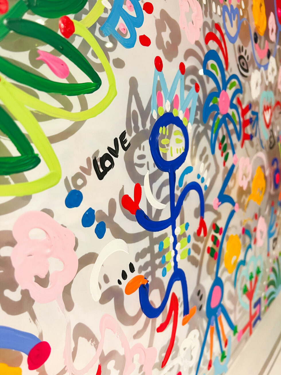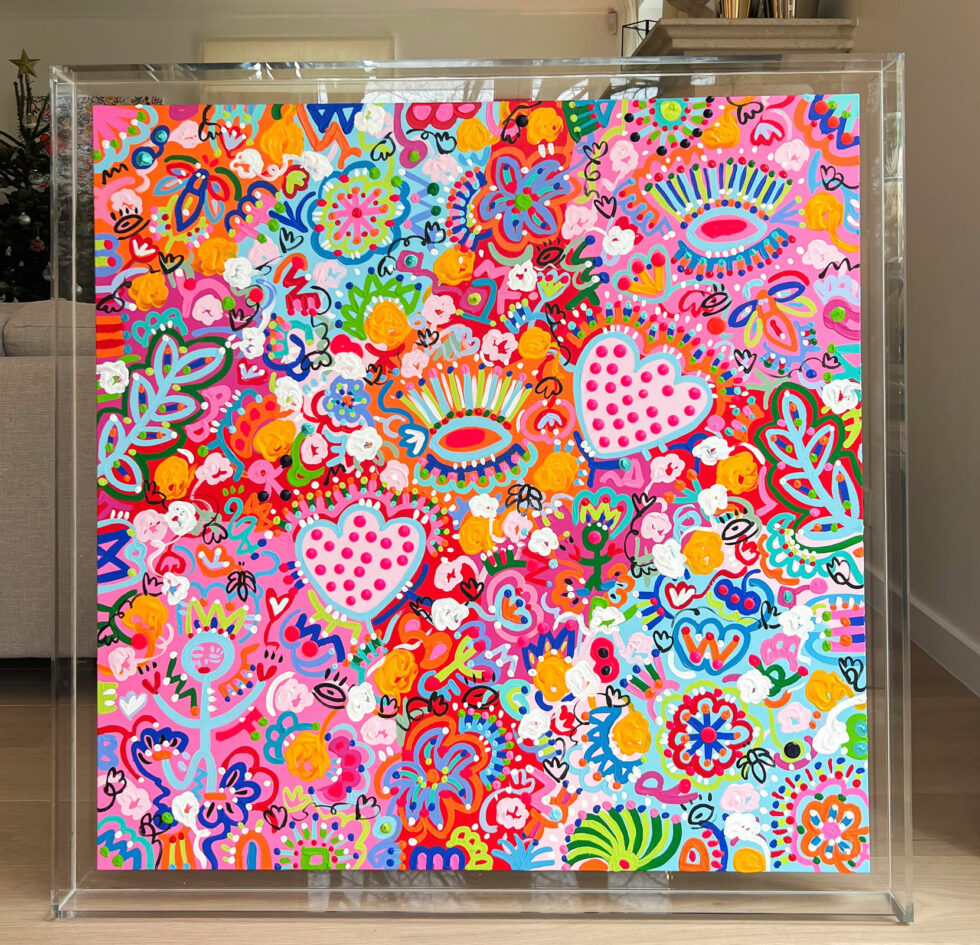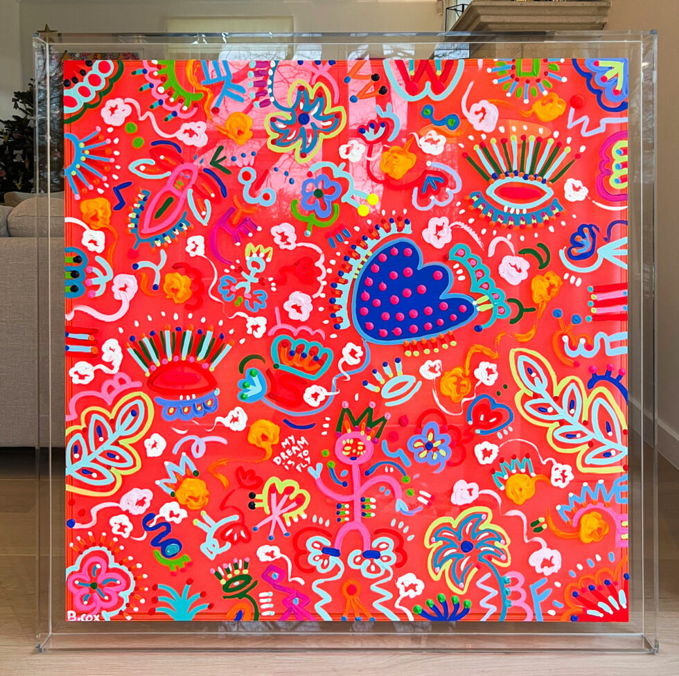 As carriers of meaning, they reappear throughout each canvas, acting as the artistic signature of this Garden of Dreams series. Their presence lends depth to the work, while maintaining that touch of humor and casualness inherent in Cox’s universe.