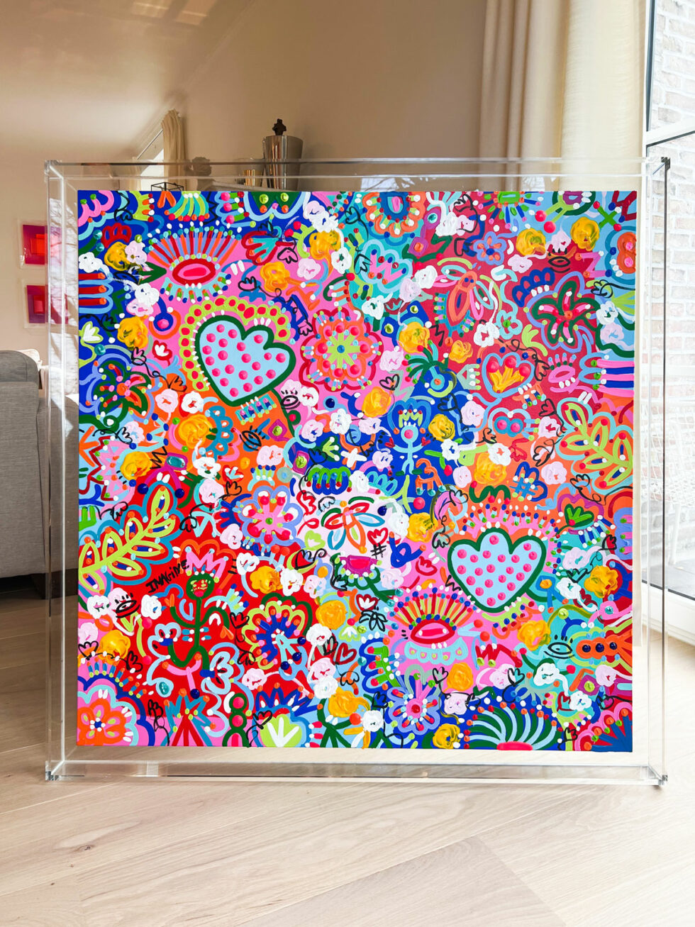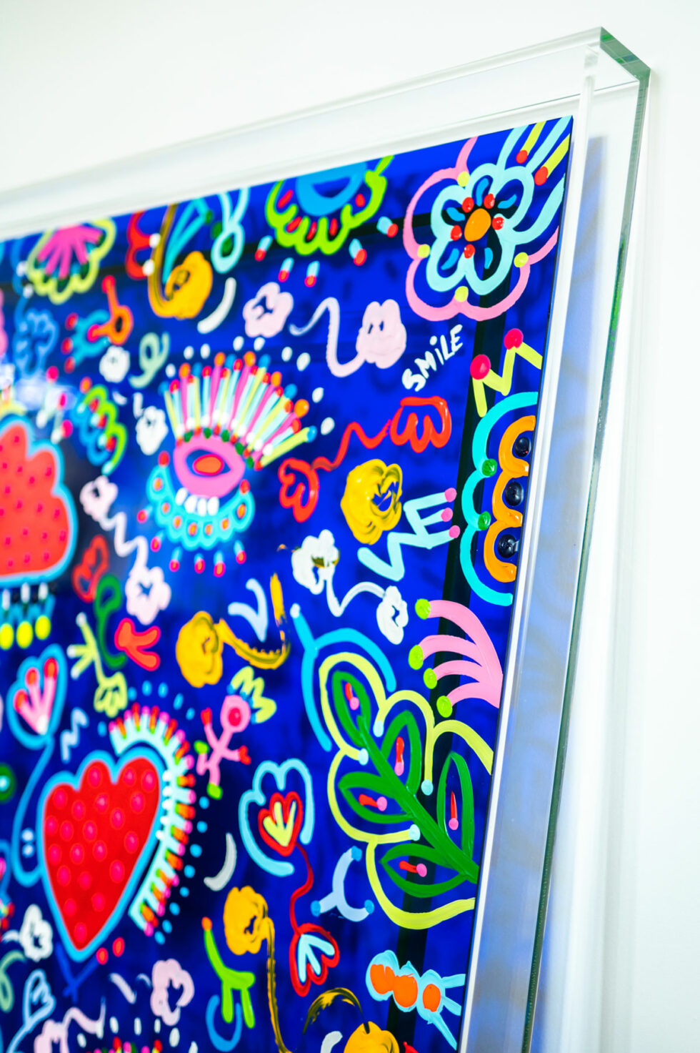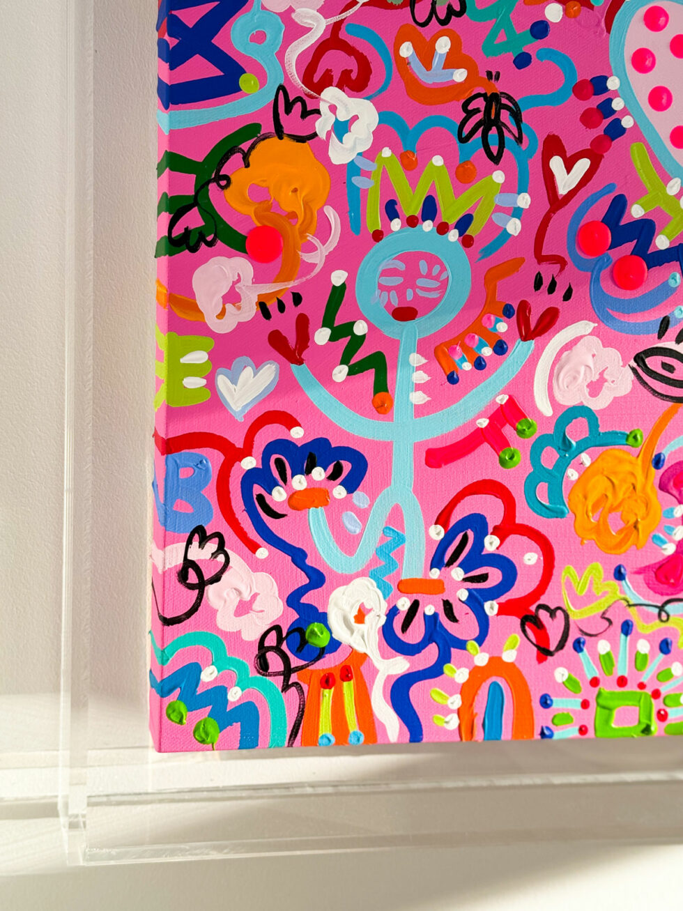 As carriers of meaning, they reappear throughout each canvas, acting as the artistic signature of this Garden of Dreams series. Their presence lends depth to the work, while maintaining that touch of humor and casualness inherent in Cox’s universe.