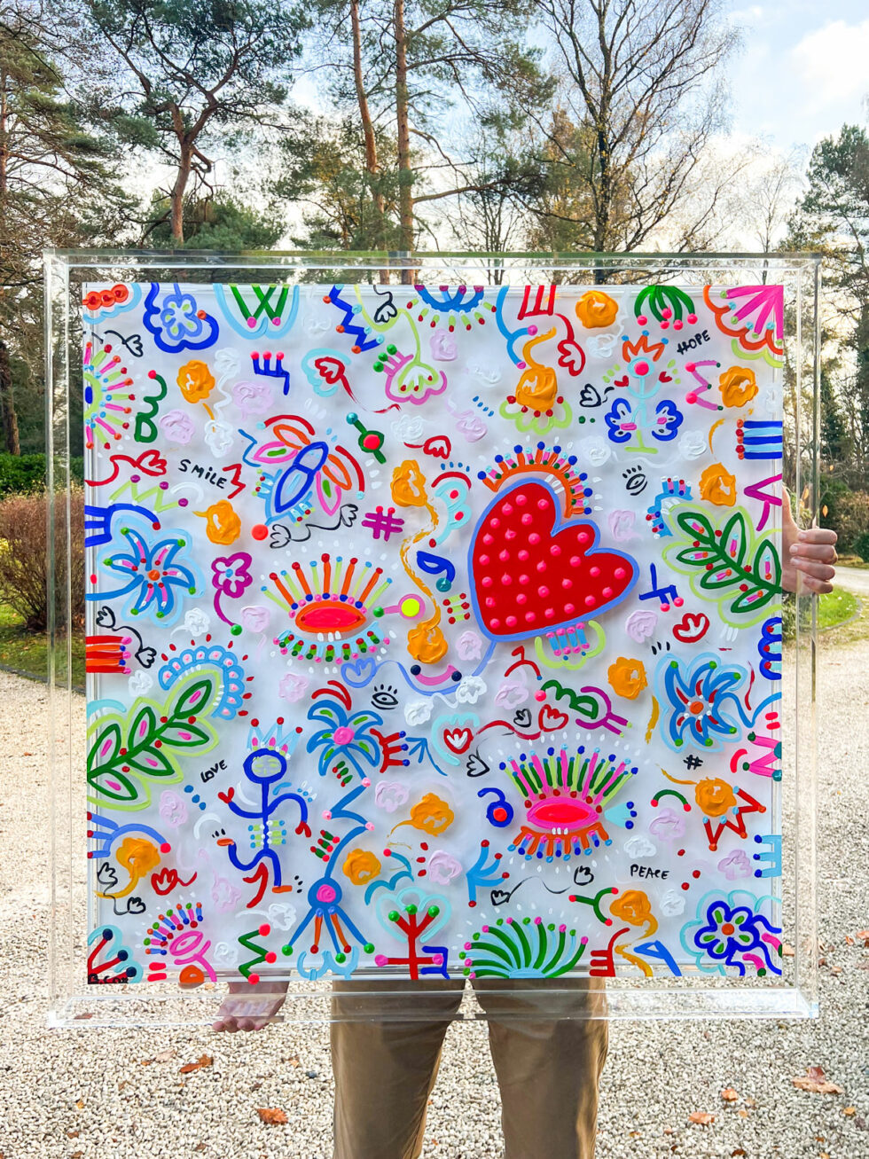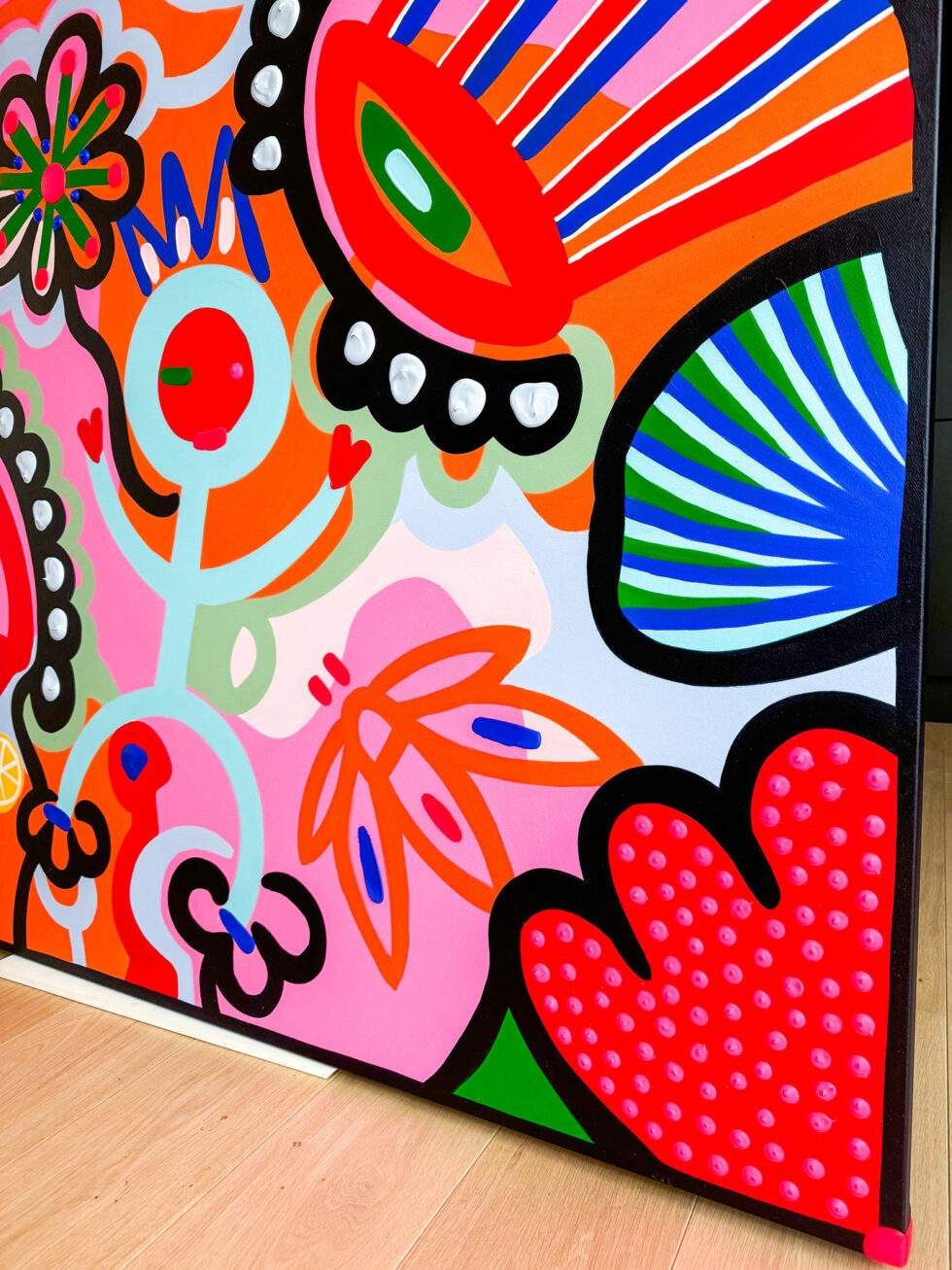 Barb’Happy, crowned little characters, also populate these canvases, where they are the Guardians of Happiness. They are a light-hearted reminder that we are all sovereigns of our own existence. We wear the crown of our lives, shaped by our decisions and dreams; true success being none other than the pursuit of happiness.