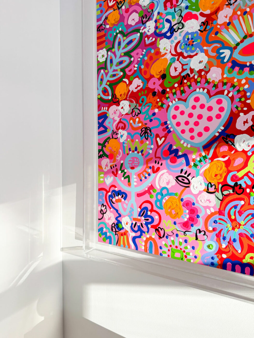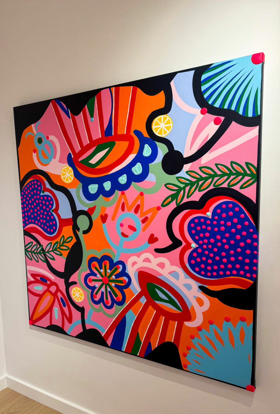 The symbols dear to the artist’s heart are all there: a mischievous Barb’Happy with heart-shaped hands, a giant Strawberry of the Heart, a mischievous COX-inelle, Eyes of waking dreams and a dragonfly in full flight.