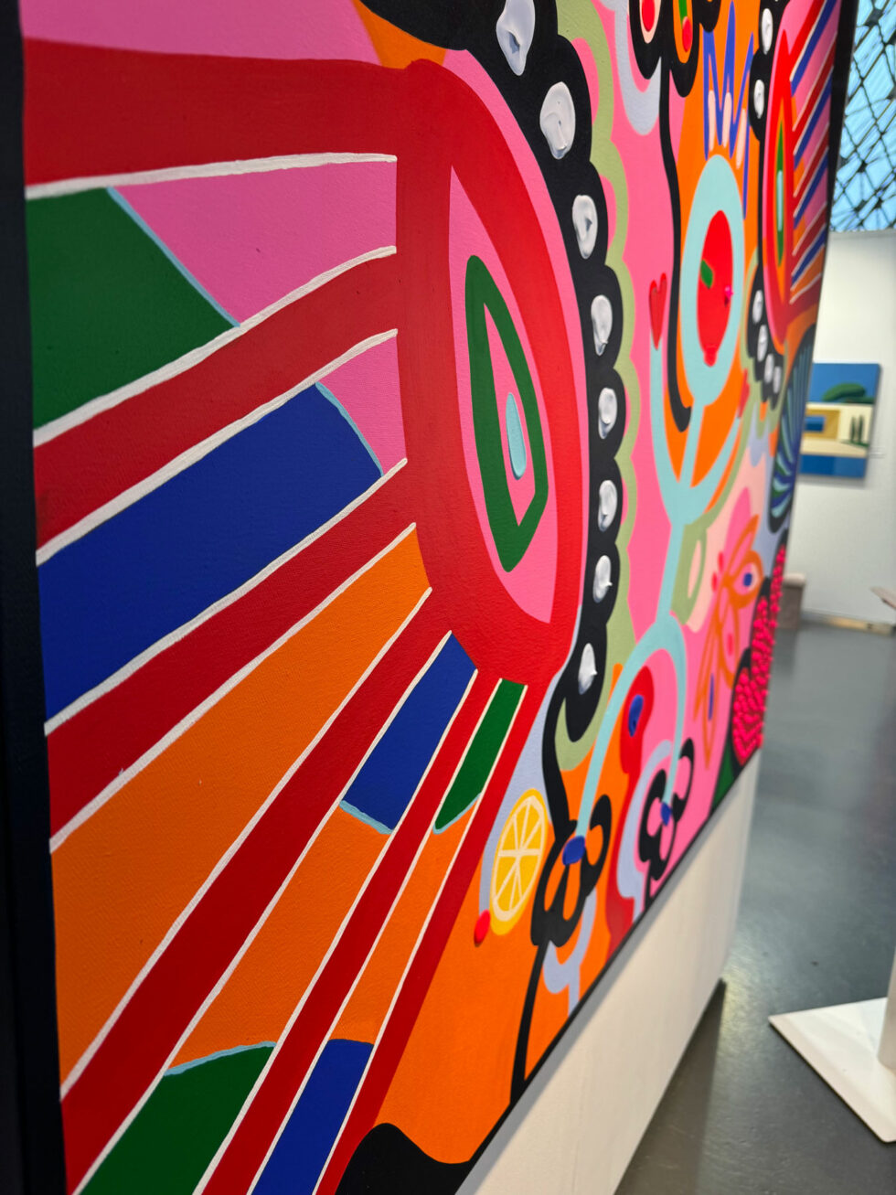 If intuition leads this dance, his hand is guided by absolute concentration to obtain a precise and perfectly smooth line. Barbara paints each shape directly onto the canvas. The sketch comes alive when she fills it with color, the patterns swinging casually before our eyes reminding us that with Cox, even harmony has a sense of humor.