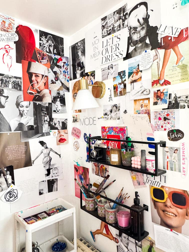 Ils sont couverts de pages de magazines pêle-mêle : des photos de mode, de design, d’univers colorés, des publicités, etc. J’ai été photographe et je reste très sensible à cet art. Je suis une passionnée de mode, un univers qui inspire directement mon travail.