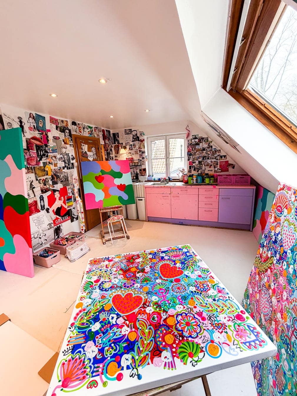 Ici, la lumière baigne l’atelier d’une clarté presque miraculeuse et lorsque l’on pénètre ce jardin presque secret qui abrite son atelier, le contraste avec l’extérieur est saisissant. On entre immédiatement dans l’univers de Barbara Cox. La couleur y règne en maître. Des tubes de peinture, disposés comme un immense arc-en-ciel, dialoguent joyeusement avec les pinceaux, tandis que des éclaboussures de peinture volontairement conservées recouvrent le sol, transformé en œuvre à part entière.